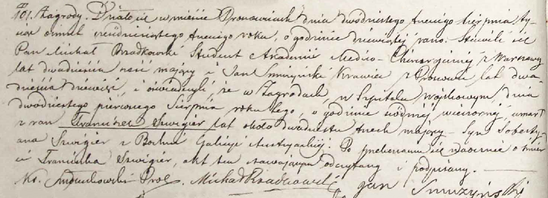 Świadkiem zgłaszającym ten zgon był Michał Rzadkowski, wówczas jeszcze student medycyny, czasowo przebywający w Proszowicach.